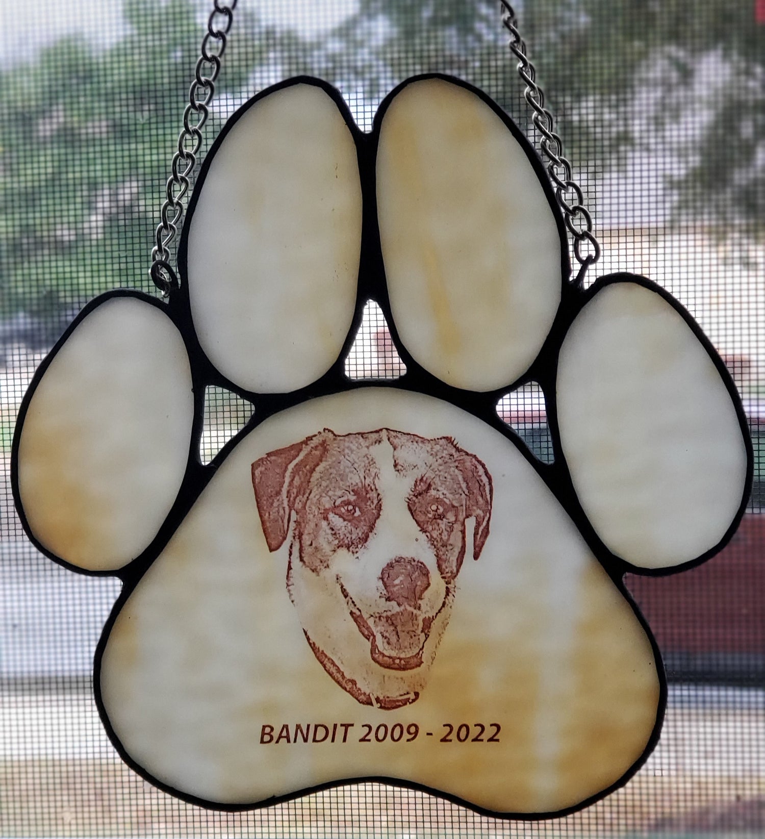When your buddy crosses the rainbow bridge it sucks. One of the most meaningful types of pieces I commemorates those friends in a beautiful custom piece with their picture and text to keep them near. These are fused to the glass in our kiln, they will never fade. Please reach out for more details.